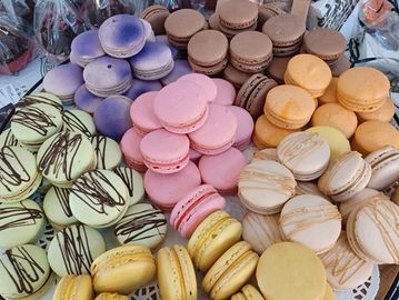 Vanilla Macaron Shells, fill with fresh Strawberry, Blueberry, Raspberry, and vanilla Butter Cream in the middle.