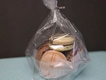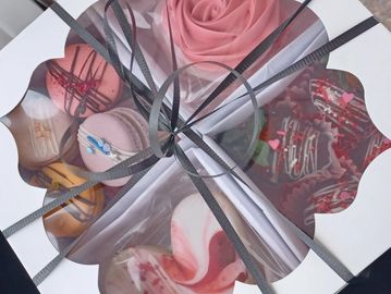 Box of 3 macarons flavors your choice, 3 Chocolate Covered Strawbarries, 2 Large Rose Meringe Cookies, 2 Sugar Cookies., and 1 No Bake Cheesecake or Hong Kong Style Mango Pudding.